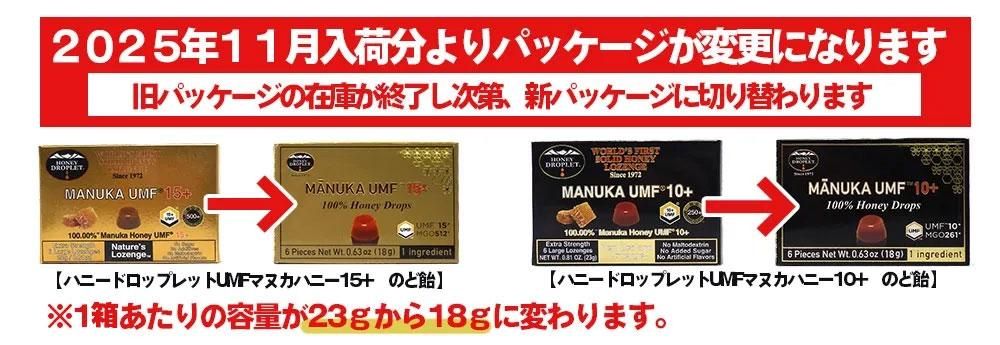 しかし、ハニードロップレット100% UMFマヌカハニー(のど飴) は、蜂蜜の固形化に成功した世界でたった一社の工場(特許製法取得)と販売提携し、世界初となるUMF蜂蜜協会認定ののど飴(ロゼンジ)ハニードロップレットが誕生しました。